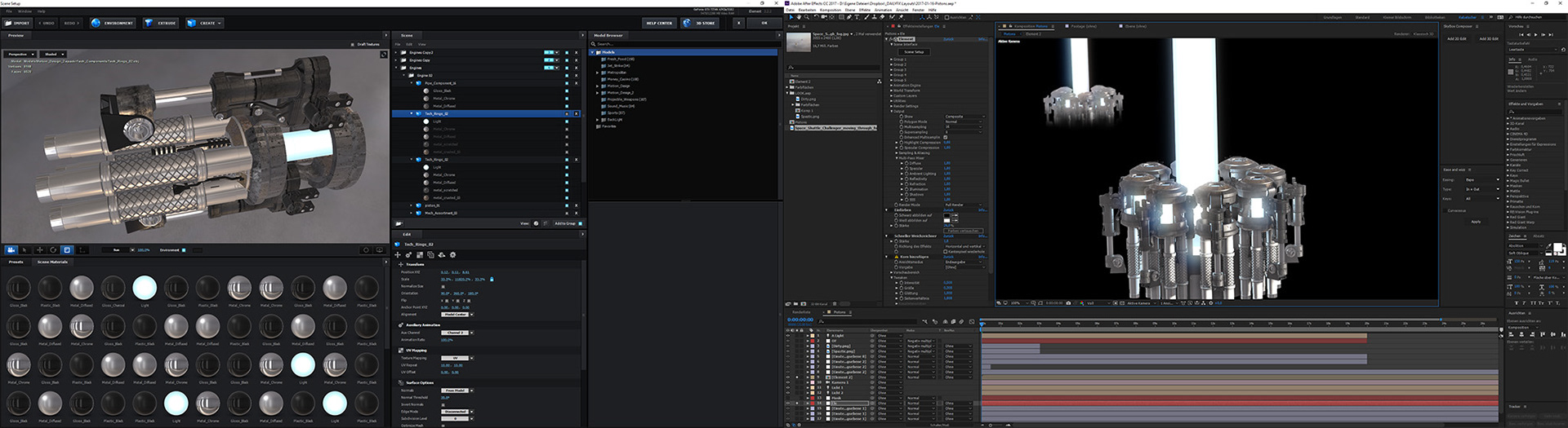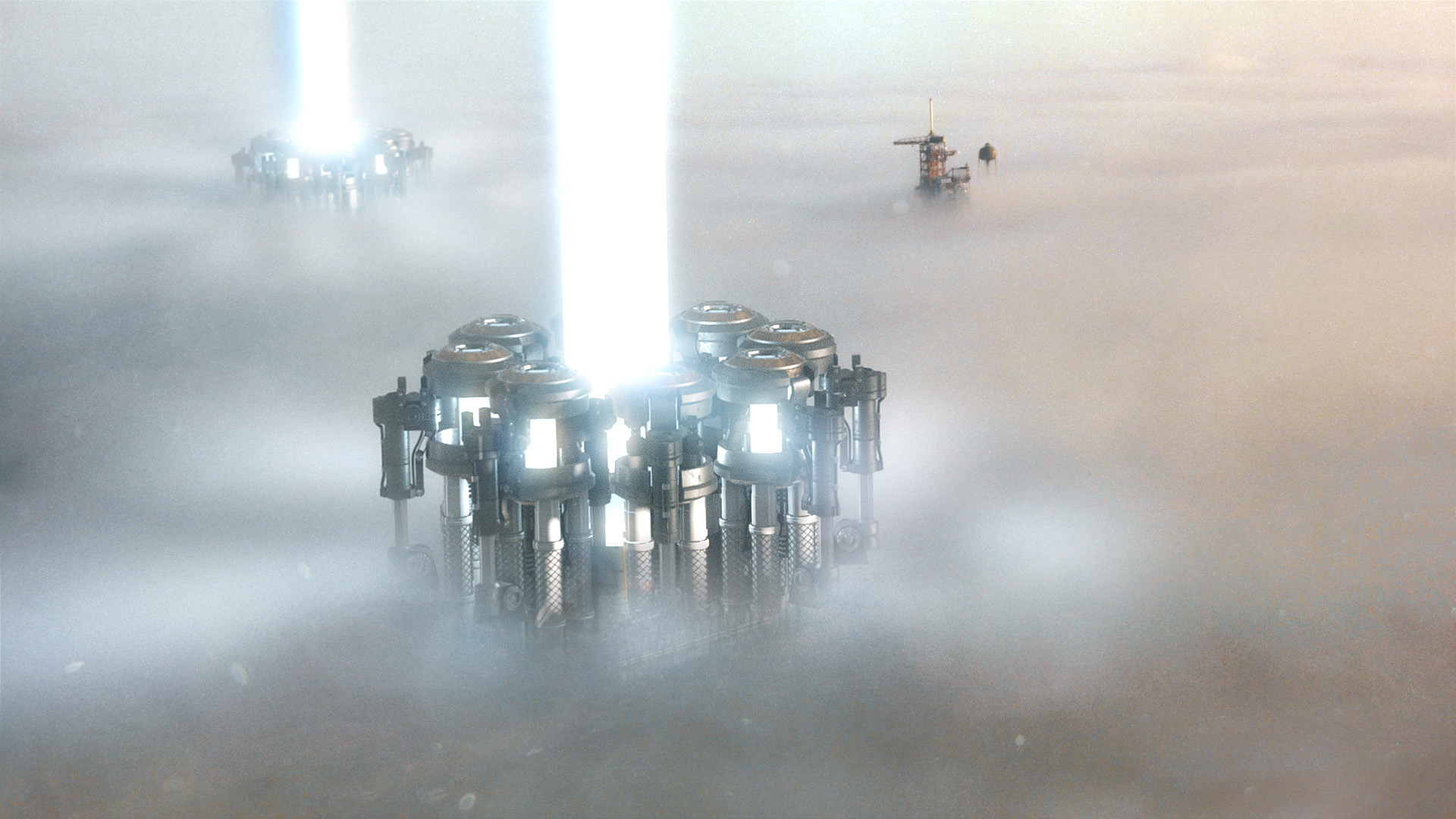 Pull a random picture off the internet and fiddle around with 3D models in After Effects. I built a piston out of several different 3D models and used this group as a particle which was simply put in a ring array and rotated until it fit. The beam is another particle and just a cylinder with a glowing texture. I used glow and distance fog to achieve the look as well as some adjustments in color, sharpness and noise.